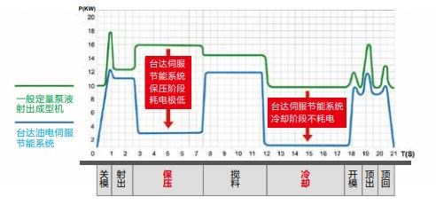 台达油电伺服节能系统,精确控制每个过程所需的压力与流量,消除高压节流的能源损耗,达到节能省电、提升成型品精度、提升竞争力、增加产能,一举数得。